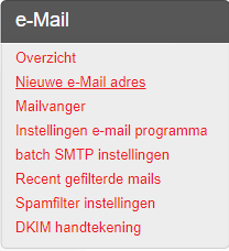 Na het inloggen kan in de middelste kolom (onderin) onder actieve domeinen doorgeklikt worden op de domeinnaam. In de kolom E-mail staat vervolgens de link "Nieuw e-mail adres".