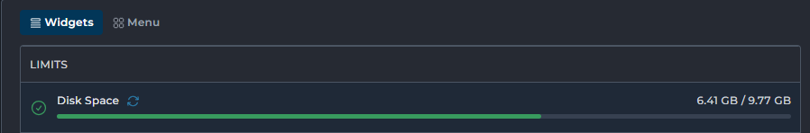 Op deze pagina zie je direct een overzicht van je account. Binnen het tabblad Widgets wordt onder andere de gebruikte schijfruimte (disk space) weergegeven.