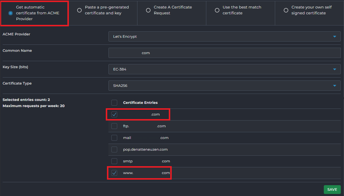 - Selecteer daarna Get automatic certificate from ACME Provider