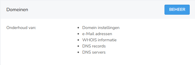 Voor het aanmaken van sub-domeinen binnen een reseller pakket kies je rechtsboven onder Domeinen voor Beheer: